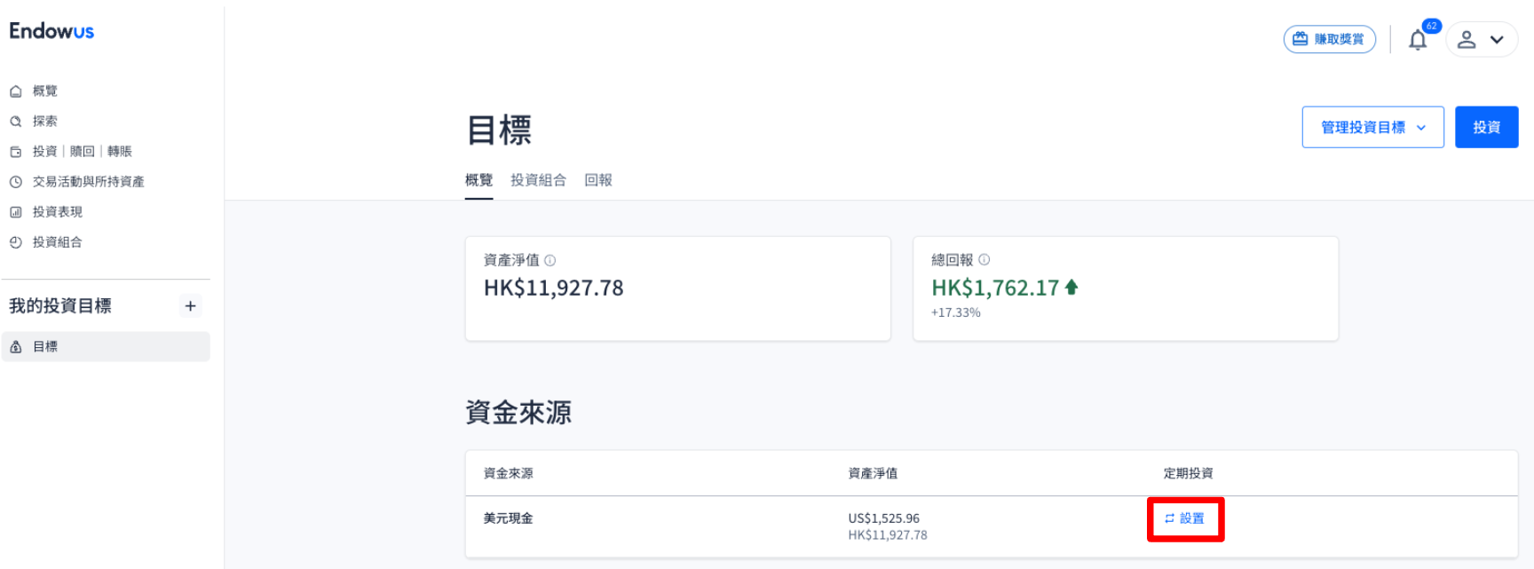 您可以在創建新目標時設置每月定期投資,也可以為現有目標設置定投。