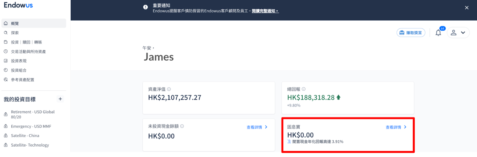 固息寶並非投資產品或集體投資計劃。固息寶服務所提供的利率並非由於 Endowus 集資投資所產生,且 固息寶不應被視為基金、計劃或集體投資的投資組合。