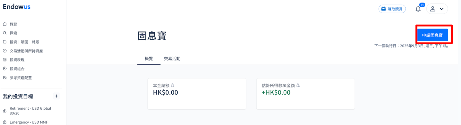 在「固息寶」頁面上,點擊「申請固息寶」按鈕。