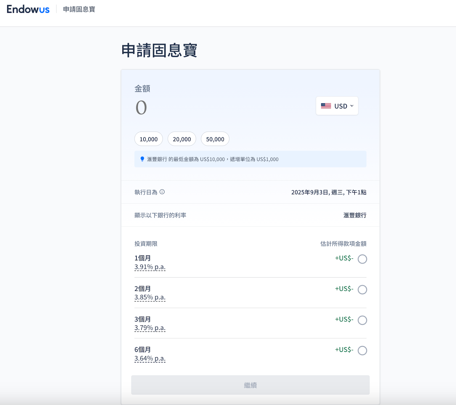 固息寶最低訂單金額為10,000 美元 或 100,000 港元,並提供 1 個月,2 個月,3 個月和 6 個月的期限選擇。