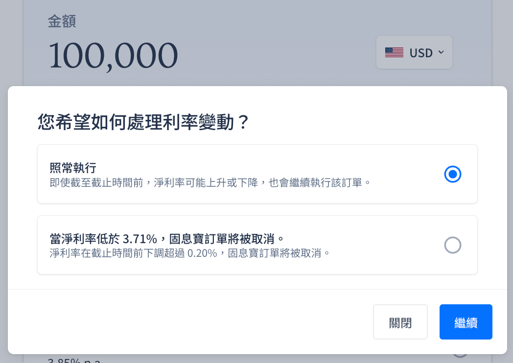 - 如果客戶選擇「即使利率水平變動,申請將如期處理」選項,固息寶訂單將以 3.6% p.a.利率執行。
